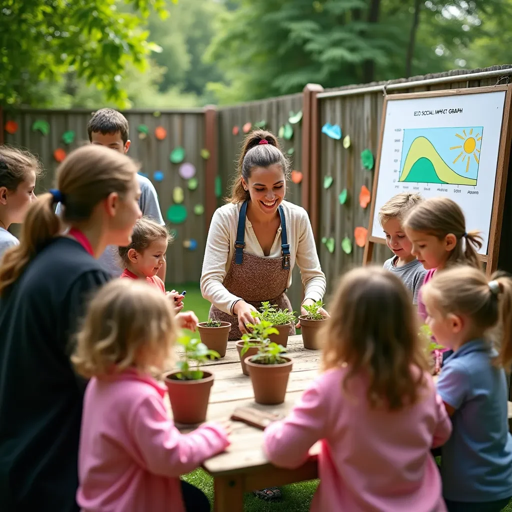 'Eco-Social Impact Graph' przedstawia kluczowe wskaźniki efektywności naszych projektów, takie jak liczba zrealizowanych inicjatyw, liczba zaangażowanych uczestników oraz zmiany w lokalnym środowisku, co ułatwia ocenę wpływu.